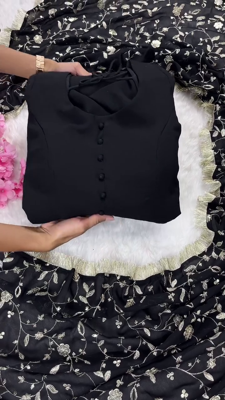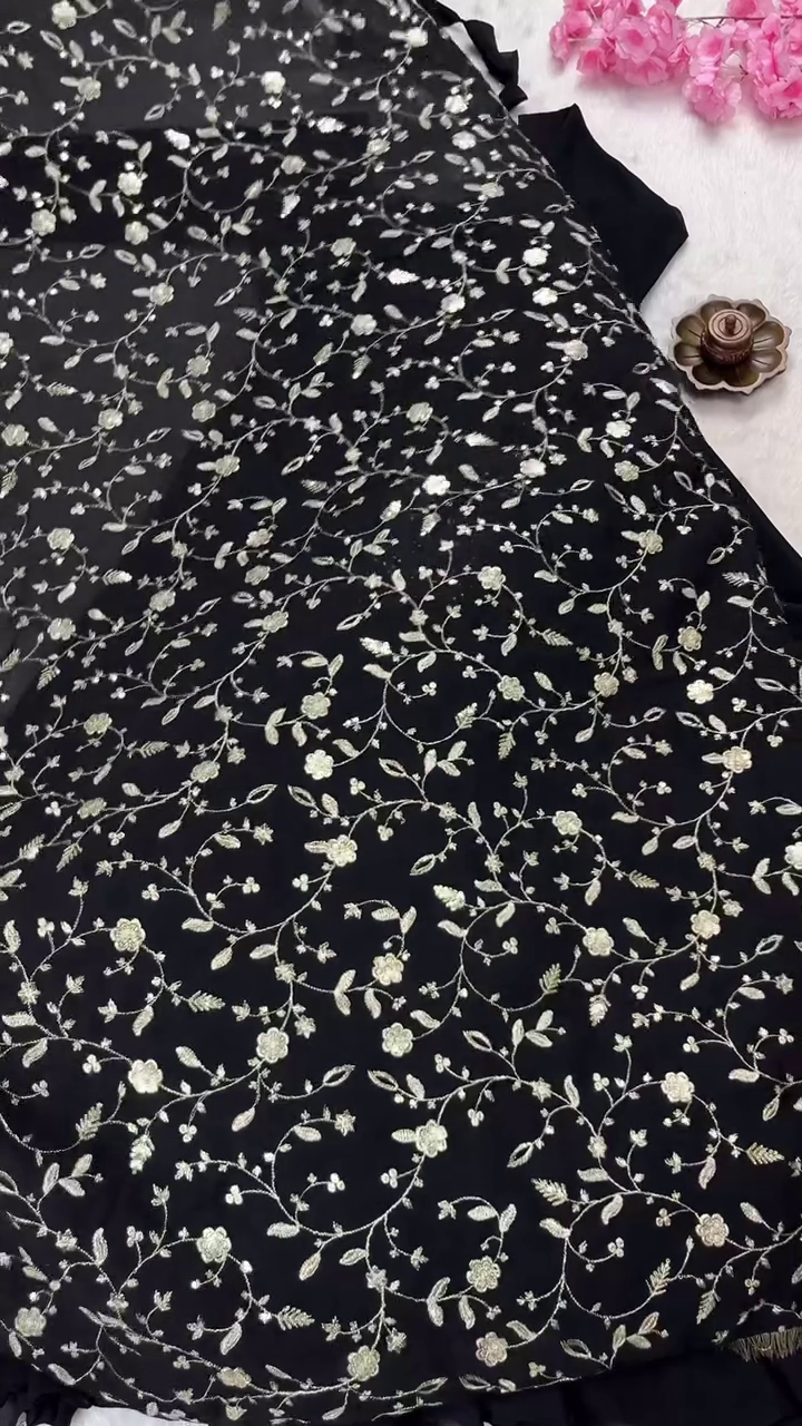 This black and silver suit set is an exceptional choice for evening wedding receptions, gala dinners, or formal festive celebrations. To style this ensemble, pair it with statement silver or white gold jewelry to complement the zari work. A sleek low bun and a bold red lip will enhance the dramatic and sophisticated vibe. For footwear, metallic silver heels or black embellished sandals will complete the look. The high-quality georgette retains its deep color and the silver work stays vibrant, making this set a durable and stylish investment for your ethnic collection.