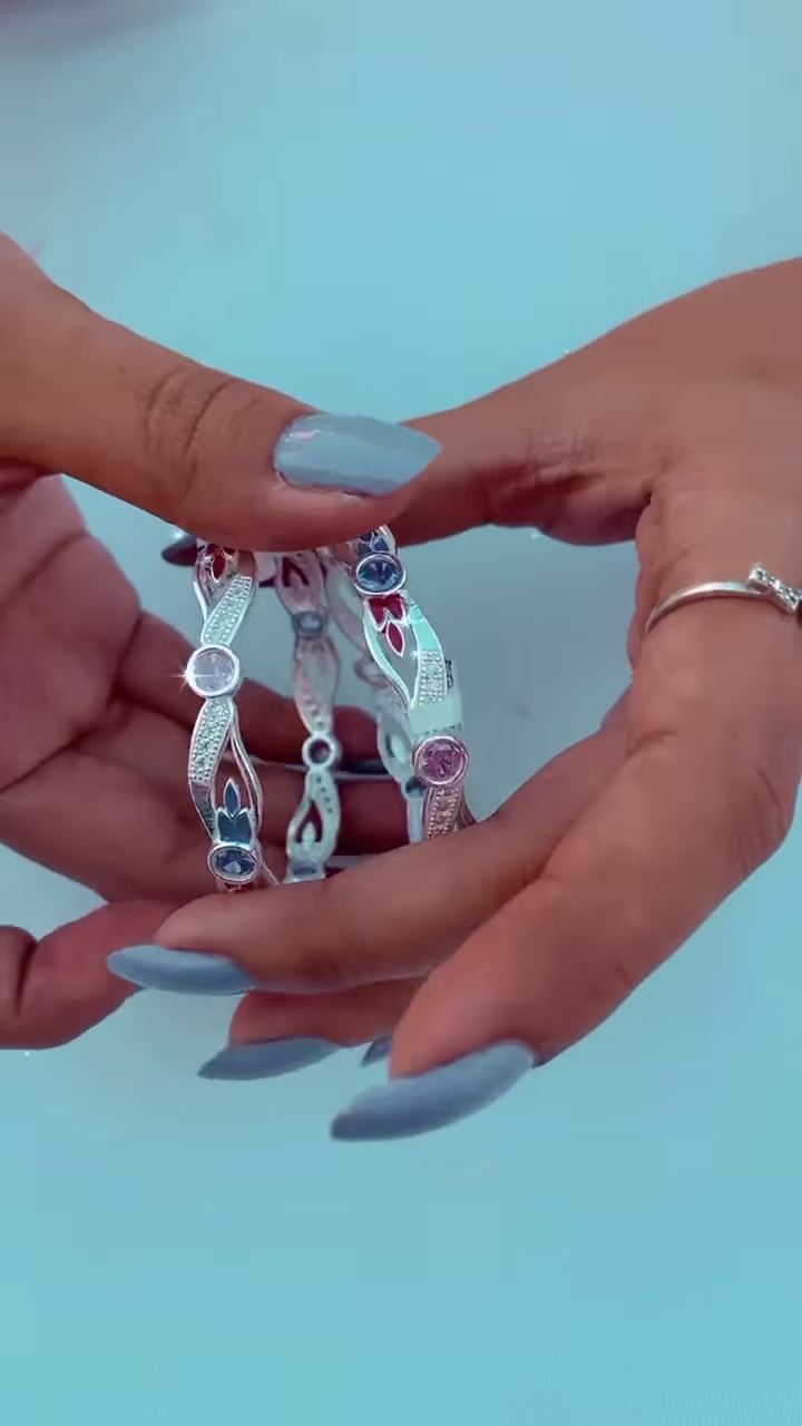 Adding a touch of color and sparkle are the carefully placed gemstone accents. These may be small, faceted stones in various hues (such as the blue and red tones visible in the image), set within the filigree or as central focal points on the bangles. The gemstones catch the light, providing a subtle yet eye-catching shimmer.