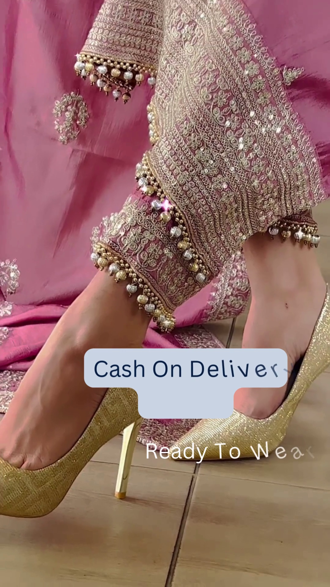 ✔️ Festive Glow: Displays the overall luminous quality of the set, perfectly complemented by gold-toned footwear as seen in the styling.