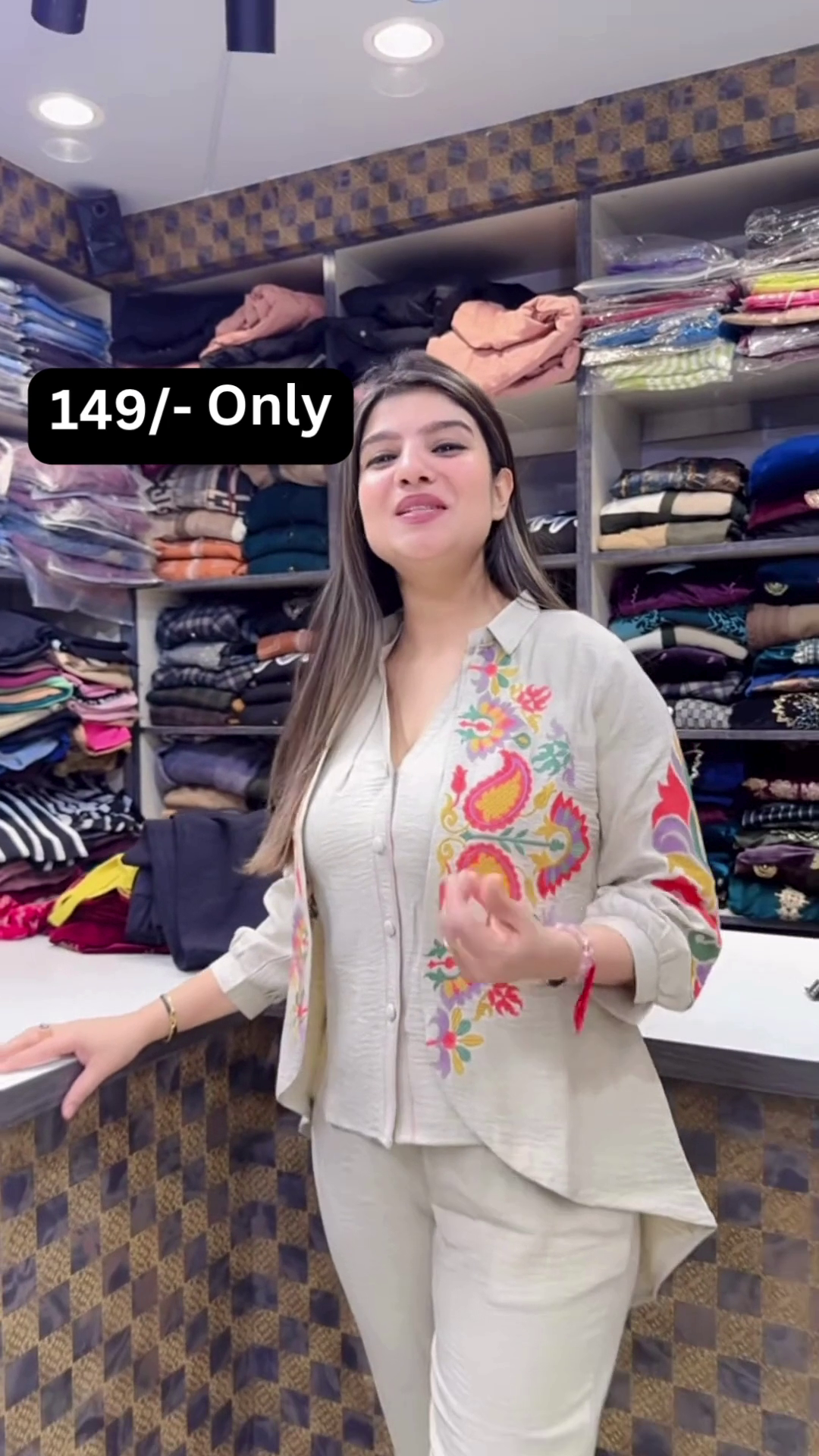 The store’s visual backdrop, with folded garments and “149/- Only” signage, suggests mass-market accessibility while still retaining boutique charm—making this outfit a perfect hero piece for storefront setups or seasonal marketing materials.