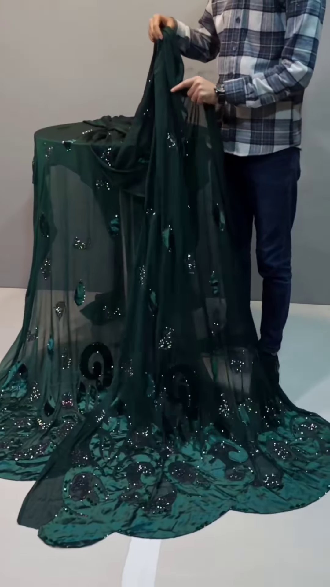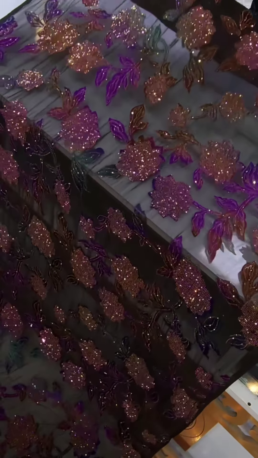 The glitter components embedded within the floral designs amplify its festive aura, making it ideal for day-to-night transformations in garments. Whether positioned in bridal trousseau drapes, stage-ready anarkali layers, or high-fashion couture detailing, this fabric commands attention while offering delicate sophistication.