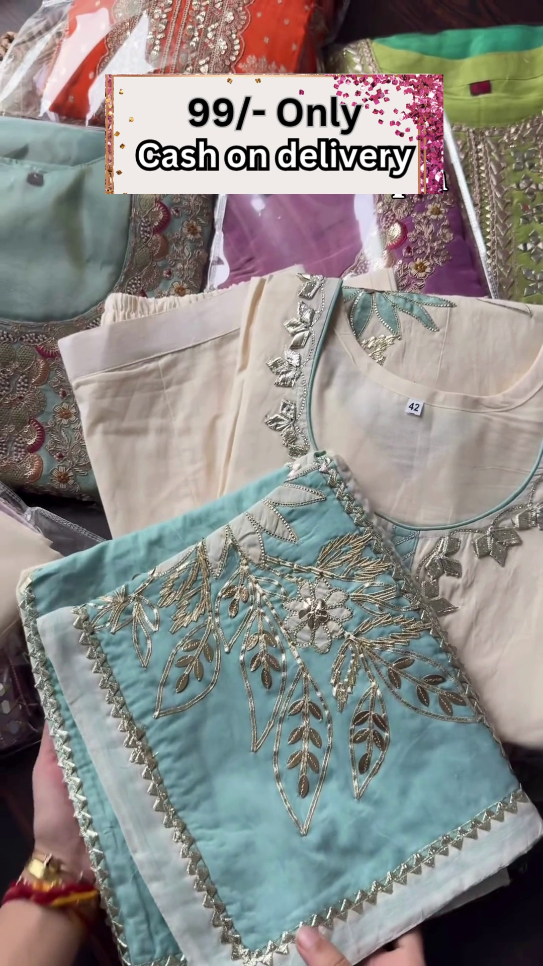 This visual setup—handheld product, organized backdrop, and bold pricing—serves well in WhatsApp promotions, social reels, Facebook ads, or e-commerce banners targeting high-volume ethnicwear seekers. It positions your offering as value-driven, variety-rich, and ready to move.