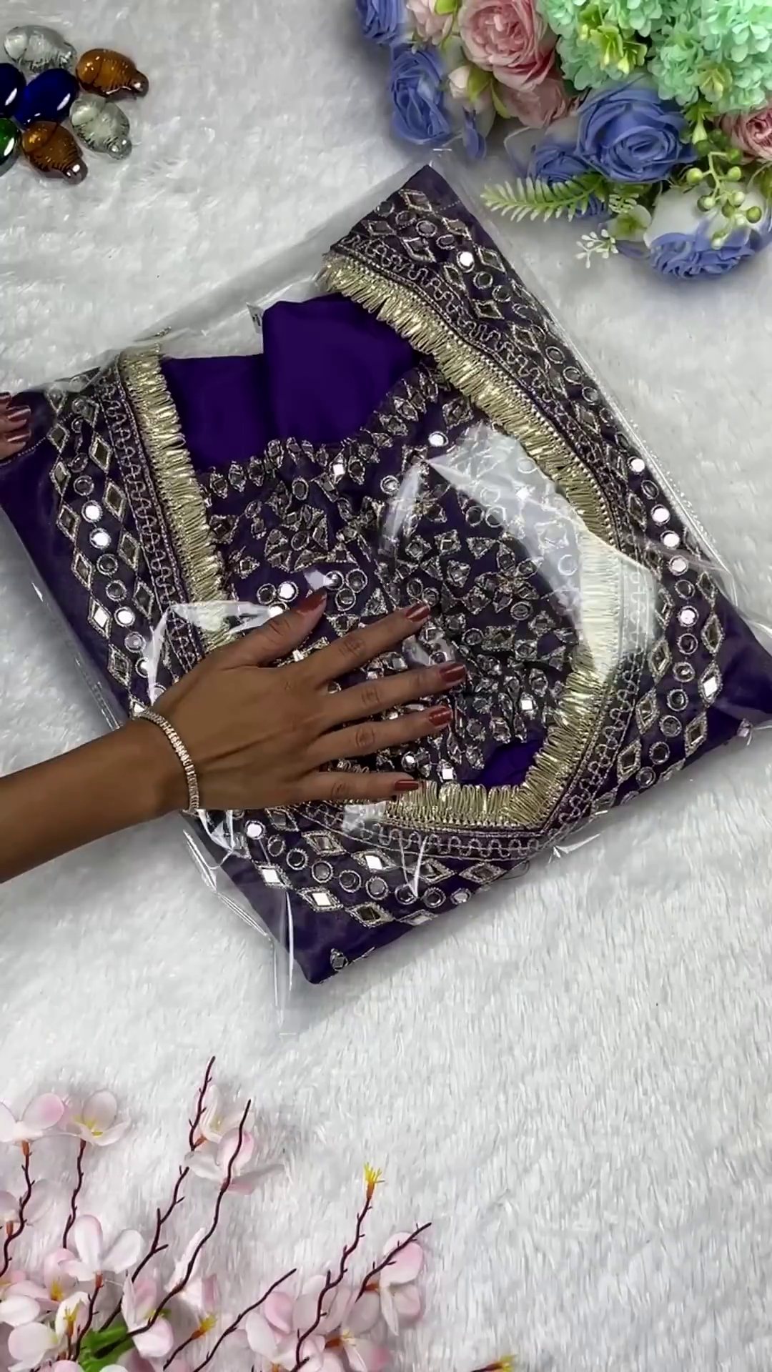 Embellishment Material: High-grade real or polished mirrors, gold-toned metallic fringe lace, and tonal thread work.
