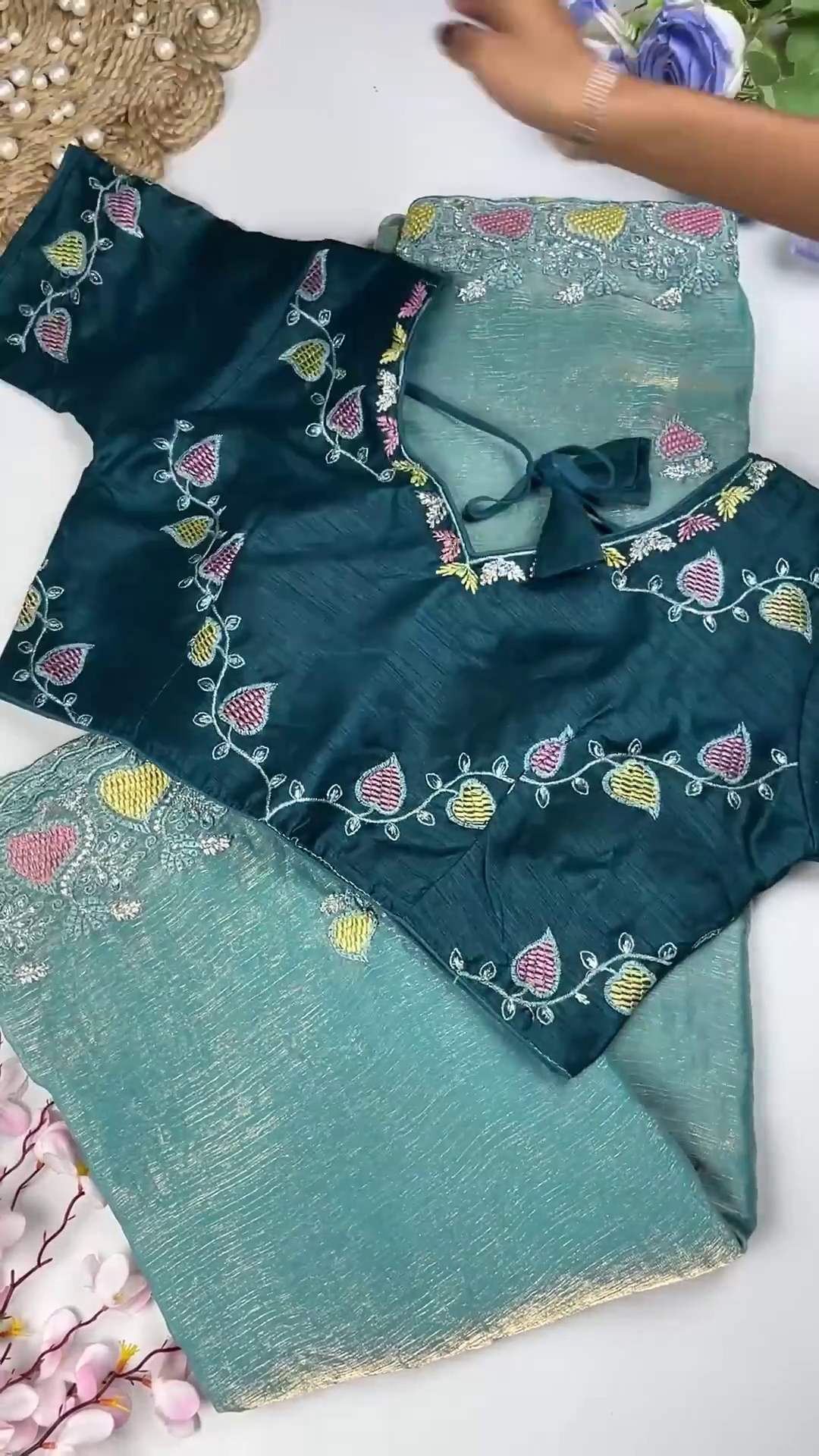 Playful Artistry: Features unique multi-colored leaf motifs on the blouse, hand-embroidered with shimmering teal, yellow, and peach silk threads.