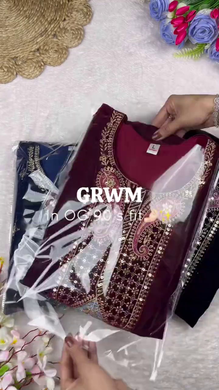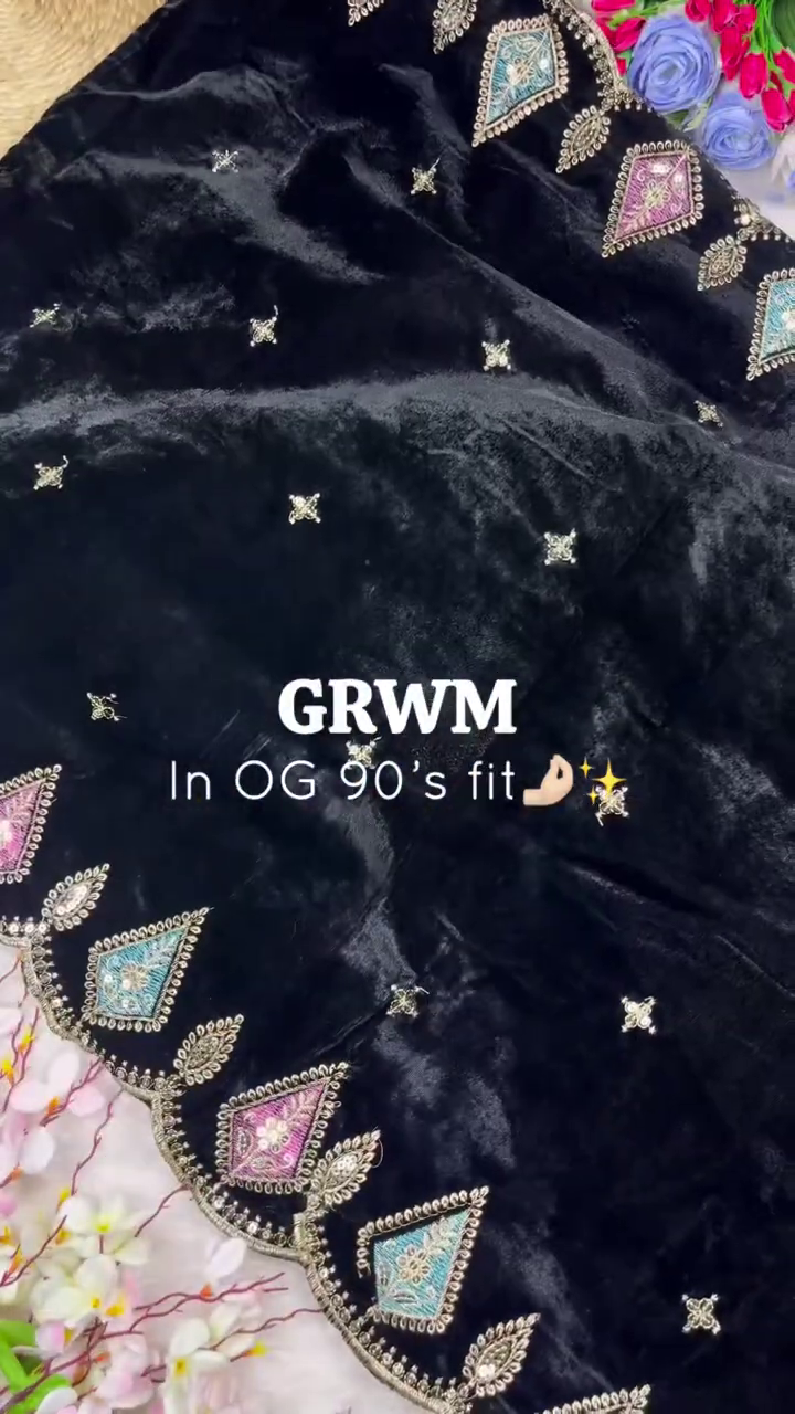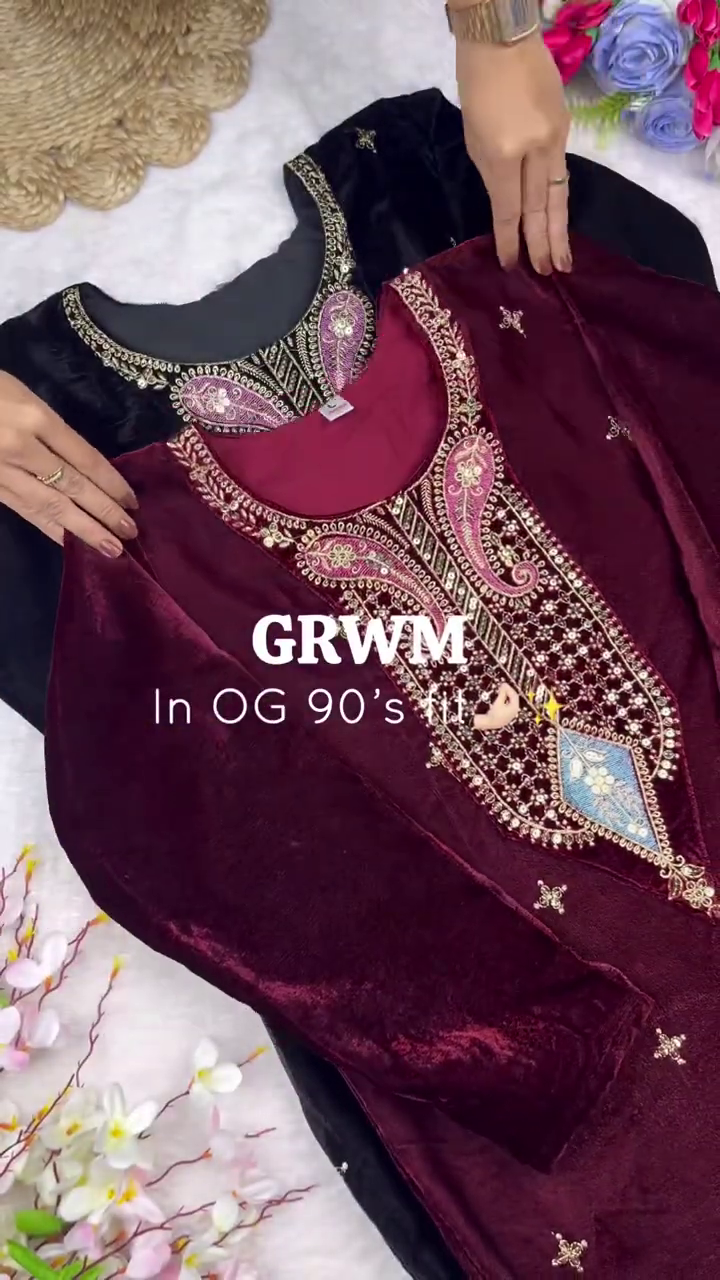 Step back into the golden era with this “OG 90’s fit” designer set. Combining the timeless luxury of plush black velvet with intricate traditional embroidery, this ensemble captures a vintage aesthetic that is perfect for formal winter celebrations and grand evening events.