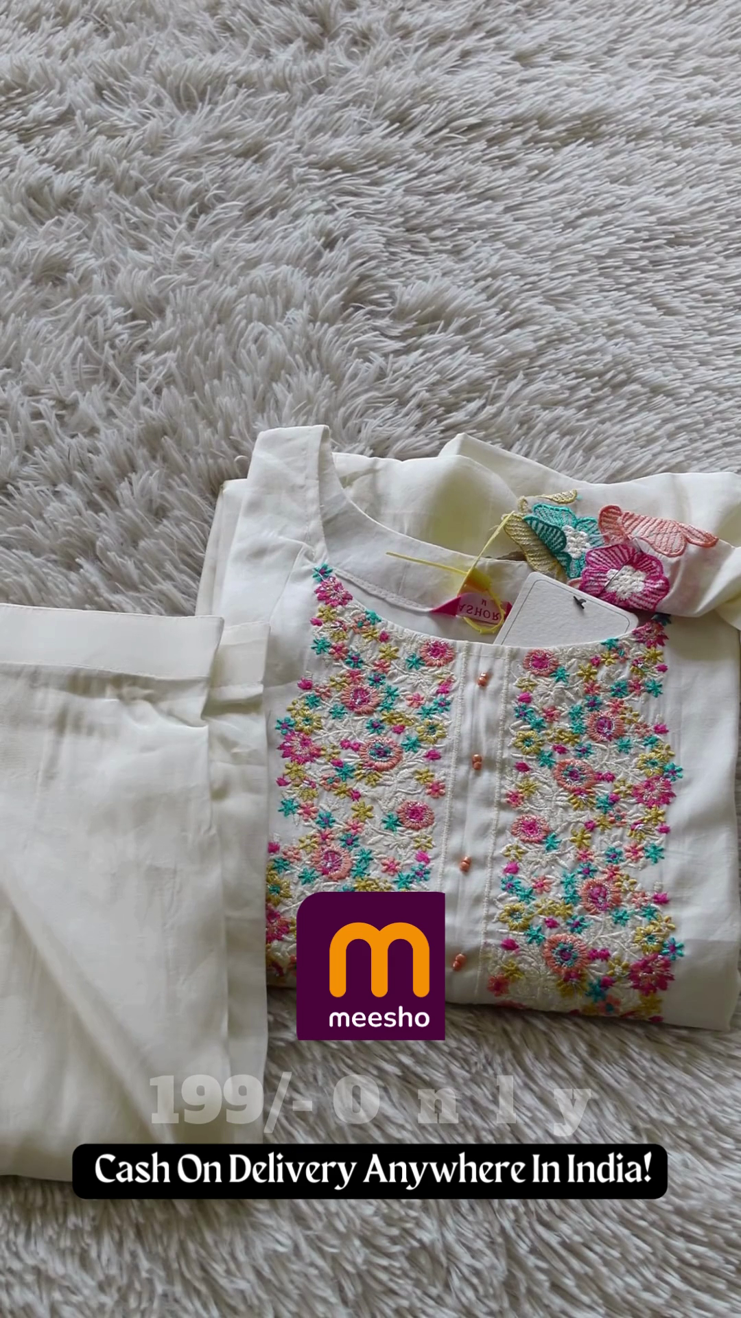 The front of the kurta is adorned with a stunning multi-color Resham (silk thread) embroidery. The floral patterns feature a palette of turquoise, coral, pink, and yellow, creating a beautiful contrast against the white base. Small mirrors are subtly integrated into the embroidery, adding a hint of sparkle that catches the light beautifully. The neckline features a row of small, delicate buttons and fine piping, showcasing the attention to detail in the garment’s construction.