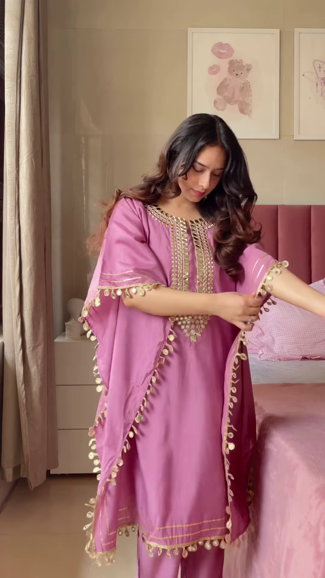 Set within an intimate room featuring artistic wall frames (a teddy bear with whimsical lips and abstract shapes), a soft pink bed, and ambient floor tiles, the portrait-style image captures fashion storytelling with lifestyle realism. This setup is ideal for boutique thumbnails, heritage-themed banners, and festive campaign drops labeled “Threaded Traditions” or “Tassel-Edge Elegance.”