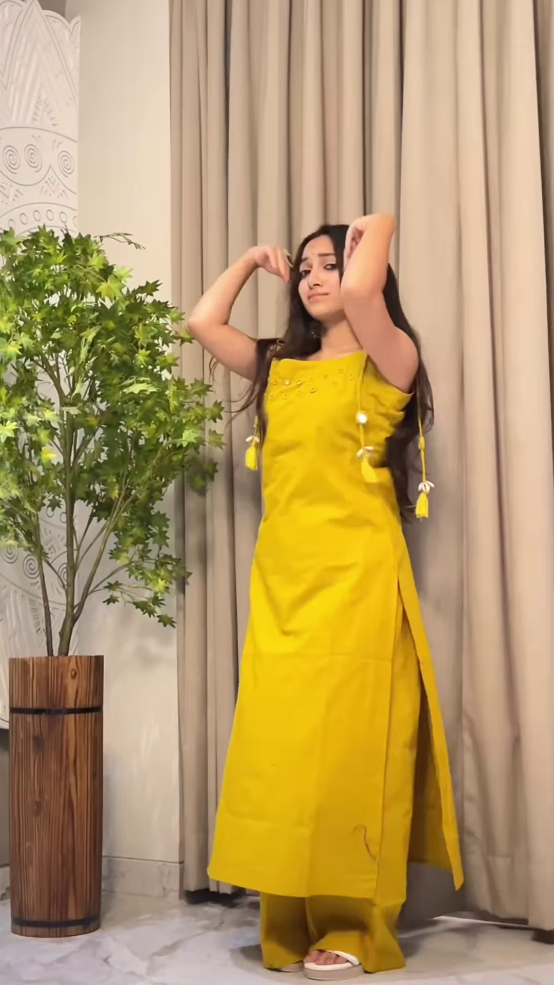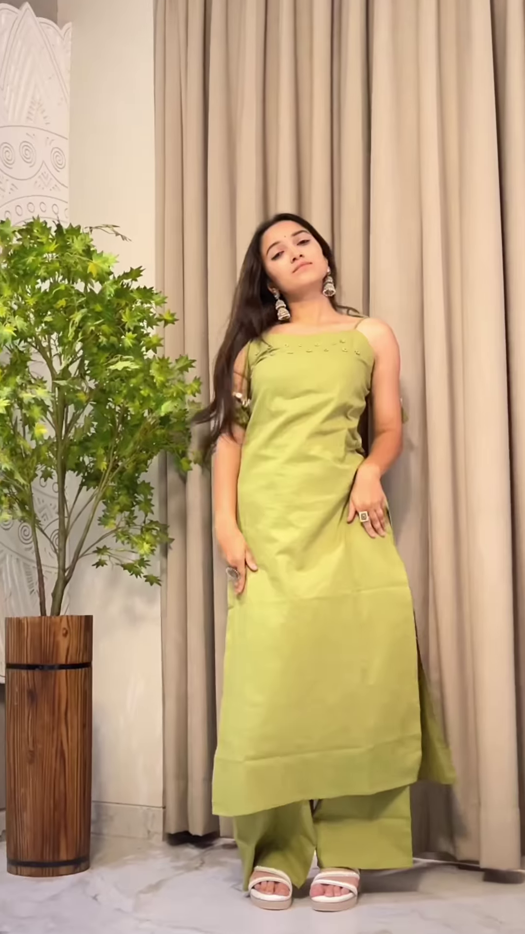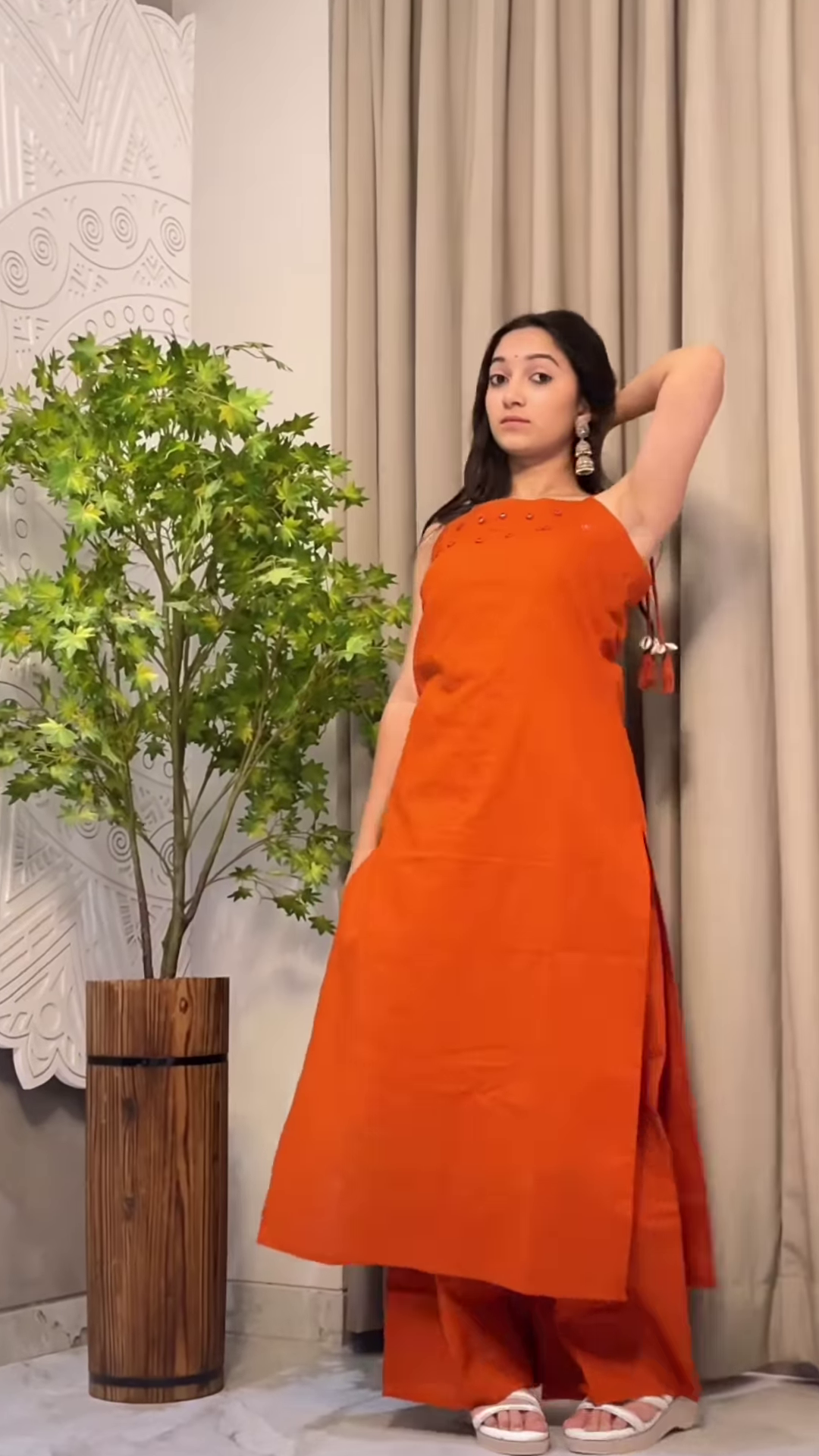 The model completes the look with white sandals and large ethnic earrings, subtly accentuating the outfit’s relaxed yet festive vibe. This styling is ideal for visual merchandising, lifestyle reels, or product listings aimed at audiences who appreciate modest silhouettes with a modern twist.