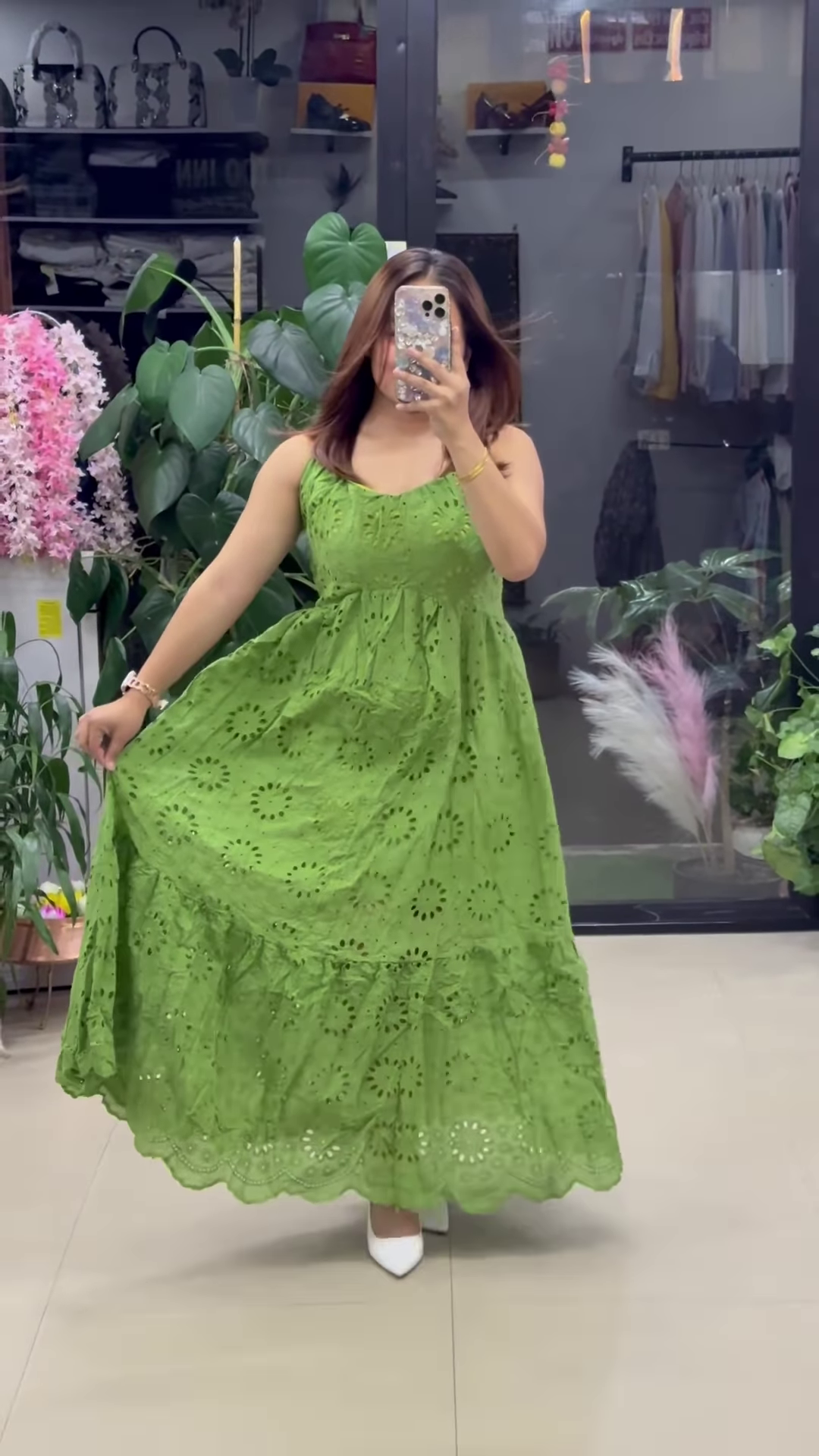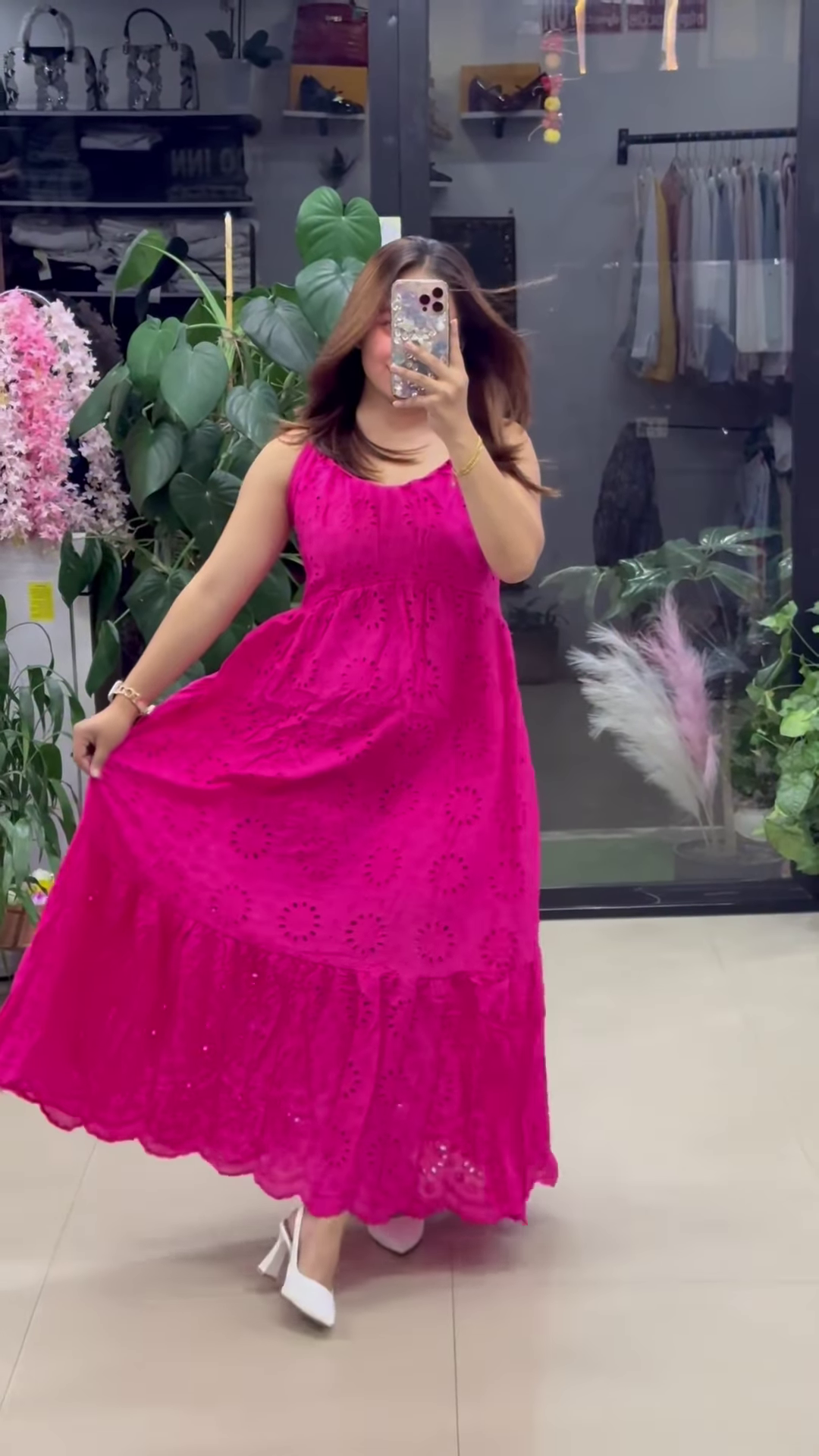 In the background of the setup, vibrant potted plants and pastel décor enhance the organic vibe of the dress, suggesting placement in a fashion boutique, personalized styling bay, or premium clothing section. This setup contributes to its appeal as a visually clean and trend-aware offering for modern shoppers.